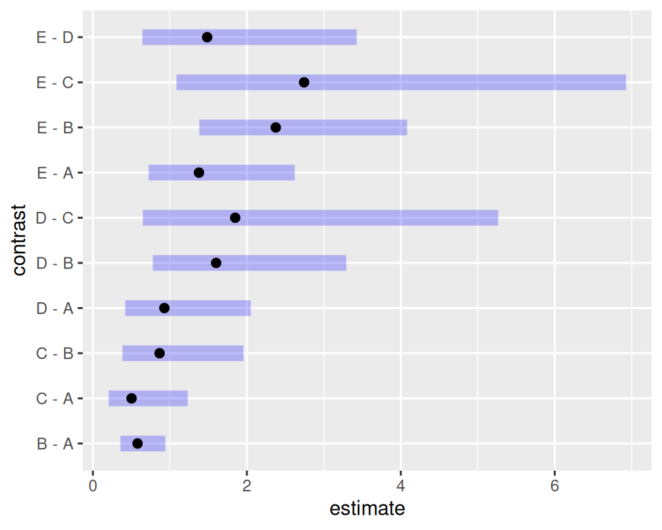 Hier sehen wir schön, welche Kontraste statistisch signifikant von Null verschieden sind, \(B-A\), \(E-C\) und \(E-B\).